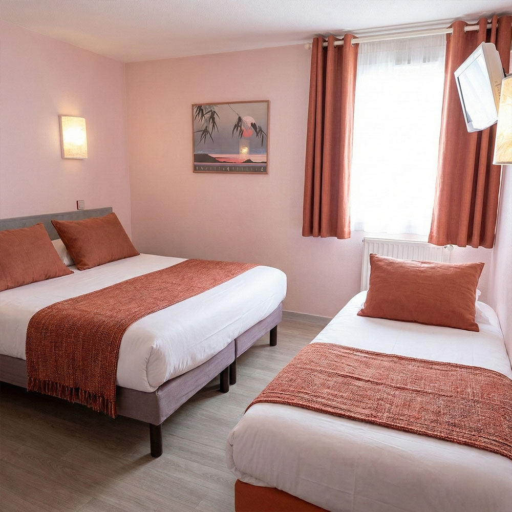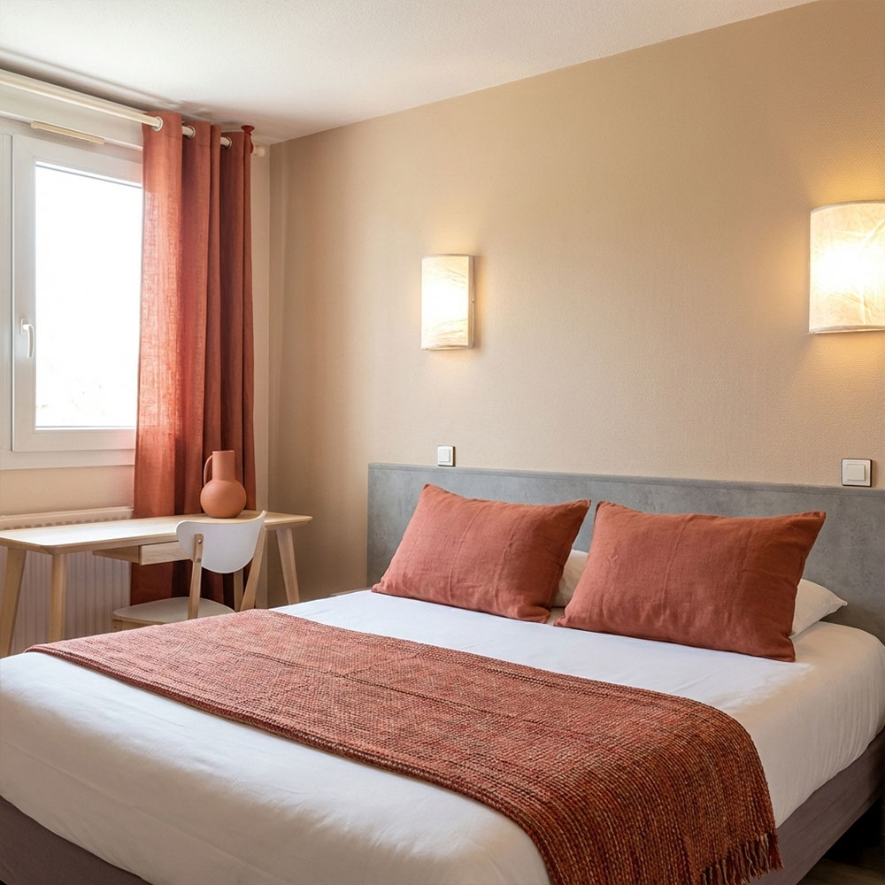 Un cocon douillet de 14m² avec grand lit (160x200), idéal pour les couples ou les voyageurs d'affaires. Décoration soignée, WiFi fibre et salle de bain moderne.